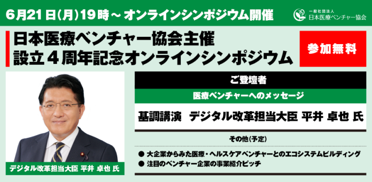 【設立4周年記念オンラインシンポジウム(参加無料)】日本医療ベンチャー協会主催 基調講演:デジタル改革担当大臣 平井 卓也 氏